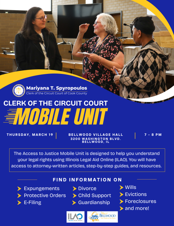 The Clerk's Office is taking the Clerk of the Circuit Court Mobile Unit to the Bellwood Village Hall. This Mobile Unit is designed to help you understand your legal rights using Illinois Legal Aid Online (ILAO). You will have access to attorney‐written articles, step‐by‐step guides, and resources.