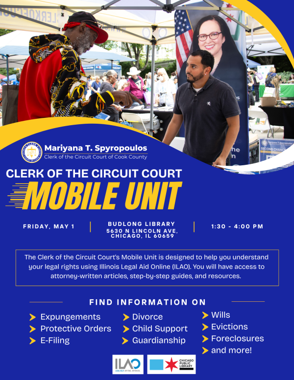 The Clerk's Office is taking the Clerk of the Circuit Court Mobile Unit to Budlong Library. This Mobile Unit is designed to help you understand your legal rights using Illinois Legal Aid Online (ILAO). You will have access to attorney‐written articles, step‐by‐step guides, and resources.