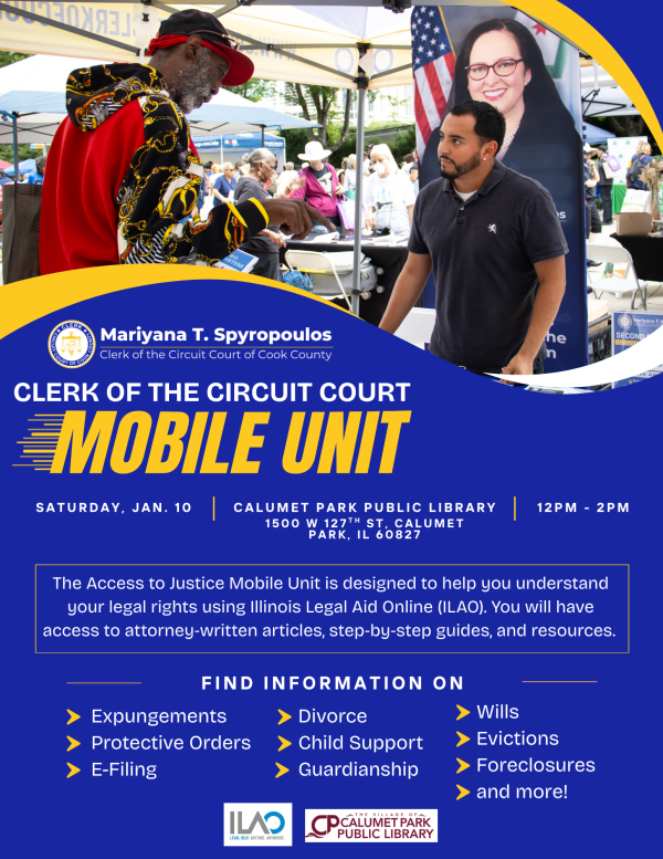 The Clerk's Office is taking the Clerk of the Circuit Court Mobile Unit to Calumet Park Library. This Mobile Unit is designed to help you understand your legal rights using Illinois Legal Aid Online (ILAO). You will have access to attorney‐written articles, step‐by‐step guides, and resources.