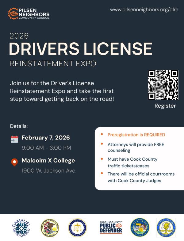 Our office will be heading out to the Driver's License Reinstatement Expo hosted by Pilsen Neighbors Community Council at Malcolm X College. At this event, attendees will have the unique opportunity to start the pathway of having your driver's license reinstated. If your case meets all the requirements and qualifies, you may even have your driver's license reinstated that day.