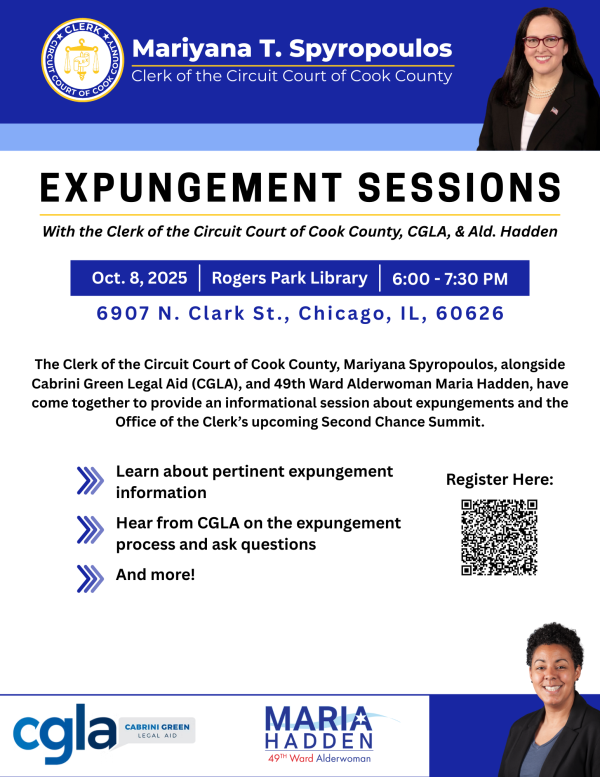 The Clerk of the Circuit Court of Cook County, alongside Cabrini Green Legal Aid (CGLA), and 49th Ward Alderwoman Maria Hadden have come together to provide an informational session about expungements and the Office of the Clerk’s upcoming Second Chance Summit. Come learn about pertinent expungement information, hear questions from CGLA on the expungement process and ask questions, and more!