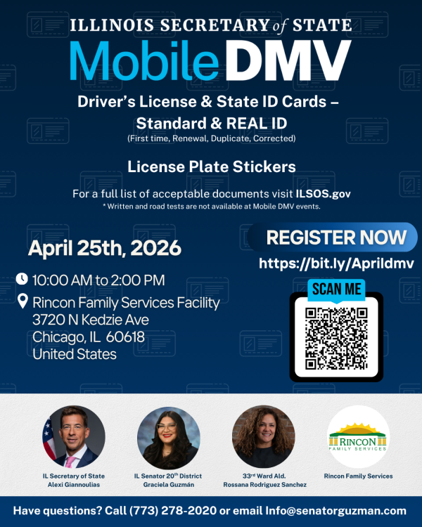 The IL Secretary of State is hosting a Mobile DMV, where you will be able to receive a driver's license, state ID (including REAL ID), and license plate stickers. Additionally, our office will be present to provide resources for the community.