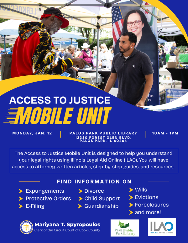 The Clerk's Office is taking the Access to Justice Mobile Unit to the Palos Park Library. The Access to Justice Mobile Unit is designed to help you understand your legal rights using Illinois Legal Aid Online (ILAO). You will have access to attorney‐written articles, step‐by‐step guides, and resources.