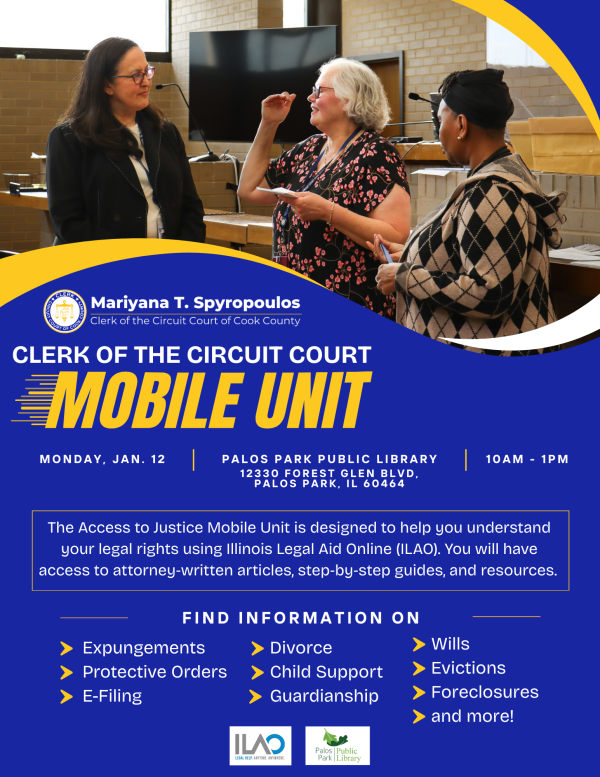 The Clerk's Office is taking the Clerk of the Circuit Court Mobile Unit to the Palos Park Library. This Mobile Unit is designed to help you understand your legal rights using Illinois Legal Aid Online (ILAO). You will have access to attorney‐written articles, step‐by‐step guides, and resources.