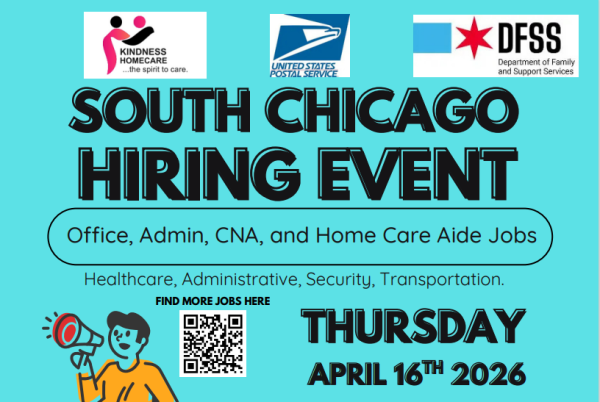 Are you interested in learning about career opportunities within our office? Come out to the South Chicago Hiring event at the South Chicago Community Service Center! Here, you will have the opportunity to learn from our team about the opportunities and resources we offer.