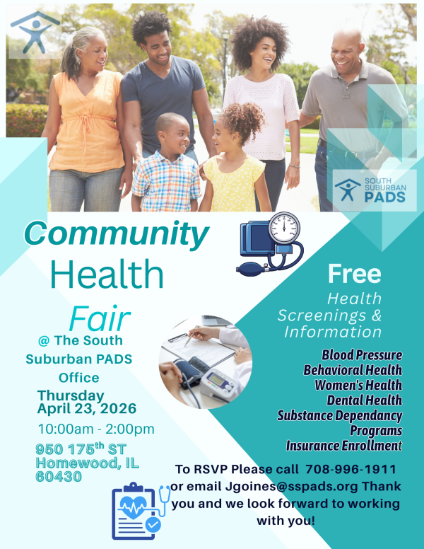 We are heading out to the South Suburban PADS office for a Communtiy Health Fair! Alongside gathering information from our office, you will be able to participate in free health screenings and information.